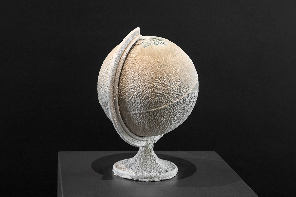Disposée par l’artiste pendant toute une année (le temps d’une révolution de notre planète) dans une grotte sous l’écoulement d’une eau chargée naturellement de calcite, ce globe scolaire s’est peu à peu recouvert d’une couche pétrifiante scintillante. L’oeuvre, associant géographie et géologie, bouscule notre perception du temps, et semble avoir ainsi figé un état du monde recartographié. |