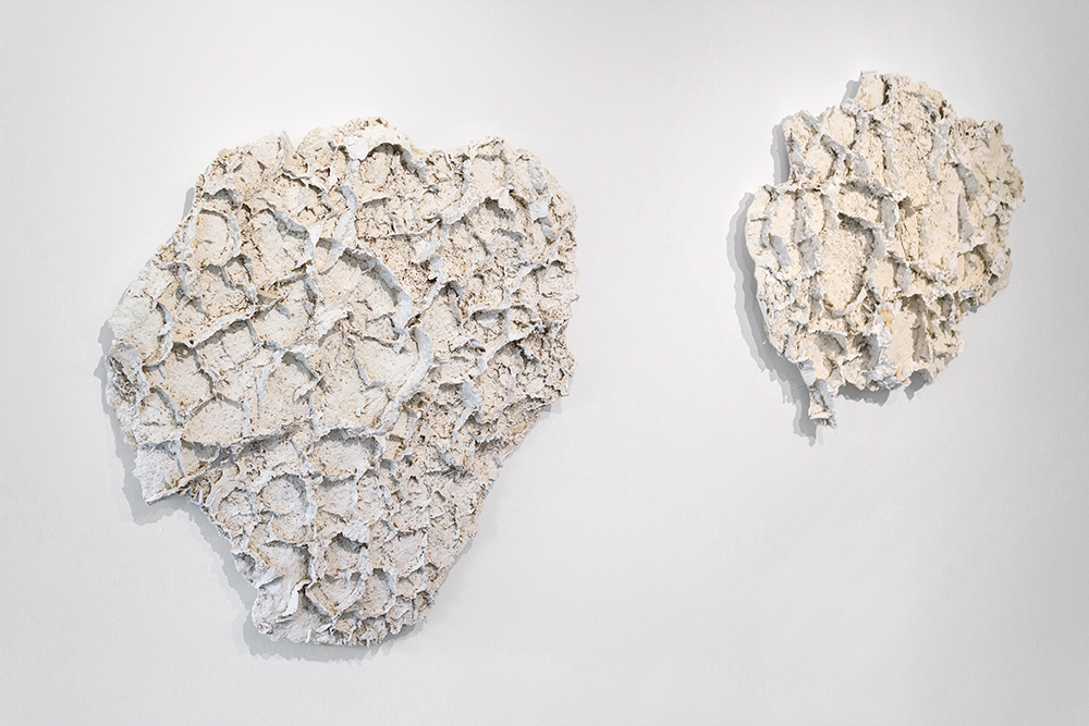 « Eprouvant l'élasticité du polymère, la matière du sculpteur emprunte donc le même chemin que la substance naturelle. On retrouve ce même processus dans la fabrication de Corail de terre #1 et #2, ou c'est cette fois-ci le plâtre qui vient s'infiltrer dans les fissures d'un sol agricole, épousant jusqu'aux plus infimes de ses craquelures. L'apparition en négatif du vide crée par les failles rappelle étonnamment les réseaux polymorphes des récifs coralliens, comme si même les manifestations invisibles de ce phénomène morphogénique étaient simplement le pendant inversé d'éléments en reliefs existants. Impossible d'échapper aux lois qui régentent la prolifération de la matière ; cette illustration par le vide en est encore la preuve. »