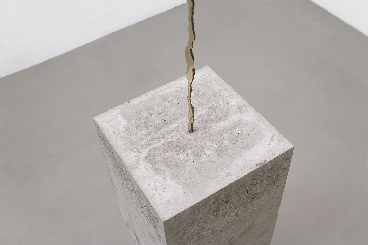 "Durant sa résidence dans l'île de Manhattan, l'artiste a pu observer les innombrables fissures au sol qui jonchent la ville, même dans les quartiers les plus triomphalement érigés de gratte-ciels incommensurables. Il y a vu une parabole sur les failles, la fragilité et la vanité du monde. L'œuvre impressionnante qu'il en a tiré est très explicite : après avoir relevé ses arborescences de fissures par empreinte et moulage, il les a fondues en bronze, puis dressées à la verticale, et fichées dans des blocs de béton, réminiscences assombries de la matière des immeubles new yorkais. Mais le relevé exprime, derrière le monde parfait visant le ciel plutôt que la terre, la fragilité de ces failles qui, naturellement, vont se propager et le fragiliser encore." (Ann Hindry) |
