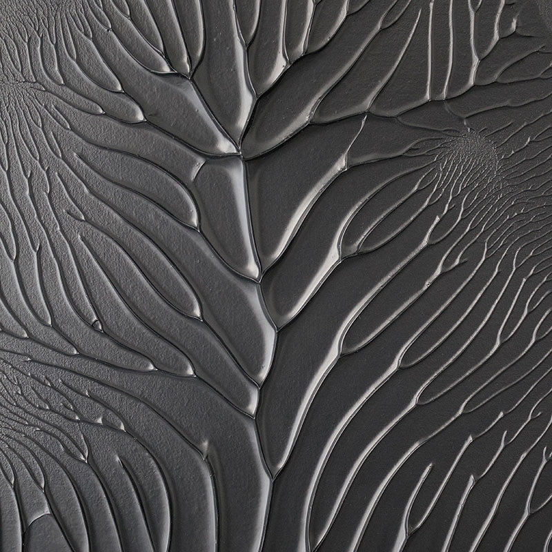 Le travail de peinture résulte de la répétition d'un même geste simple et primordial, qui est à la fois un héritage du Rorschah et une réminiscence de l'enfance : contraindre de la peinture entre deux surfaces, plier, déplier puis regarder. Observant soigneusement les motifs arborescents en surface générés par la matière arrachée, l'artiste peaufine au fil des années sa technique, et développe les outils qui permettent de trouver un point d'équilibre entre l'aléa du processus naturel, et la chorégraphie du geste qui le contraint. Il en résulte dès lors de grandes toiles recouvertes en surface d'une silhouette dont vient s'extraire en relief des arborescences fractaliennes partant de la base du tableau puis venant s'échouer en d'infimes ramifications. Ce travail d'abord achrome puis monochrome noir se décline depuis 2013 dans des couleurs emblématiques associées aux voyages et contextes de production : bleu outremer et vert de chrome. |