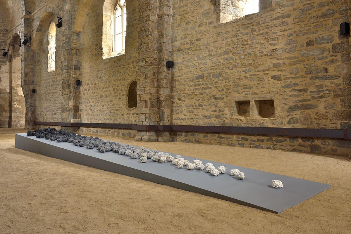 Eboulis, chute, empreinte. L'ensemble des pièces rassemblées à Saint-Jean-d'Orbestier fait écho à l'idée d'événements naturels dans un rapport au temps que souligne la multiplication des modules qui les constituent. Leur déclinaison à partir de plusieurs matrices, semblables à des peaux en négatif, qui sont employées à leur réalisation les inscrit, tout à la fois réellement et virtuellement, dans la dynamique d'un continuum qui se développe à l'infini et dont l'origine remonte à une temporalité indéfinissable. Au centre de la nef, l'éboulis de clones d'une même roche volcanique, que l'artiste a installé sur un plan légèrement incliné, tout en longueur, oblige le regardeur à une déambulation quasi initiatique à l'expérience du temps. Leur aspect de nucleus informes, colorés dans la masse suivant un processus d'intensité progressif semblable au chiaroscuro de la Renaissance, les font ressembler à des objets lapidaires issus des profondeurs mêmes du sol. Intitulée Le Commencement (2015-2019), cette installation qui est une version augmentée d'un modèle antérieur « aborde tout autant la question de l'origine au travers de celle du multiple et de l'activité volcanique terrestre que celle de notre rapport à la nature la plus brute et élémentaire dans cette tentative inquiétante de la substituer par clonage », selon les propres mots de l'artiste. Métaphore de la naissance d'une forme, elle interroge la question du double, toujours semblable mais jamais identique.