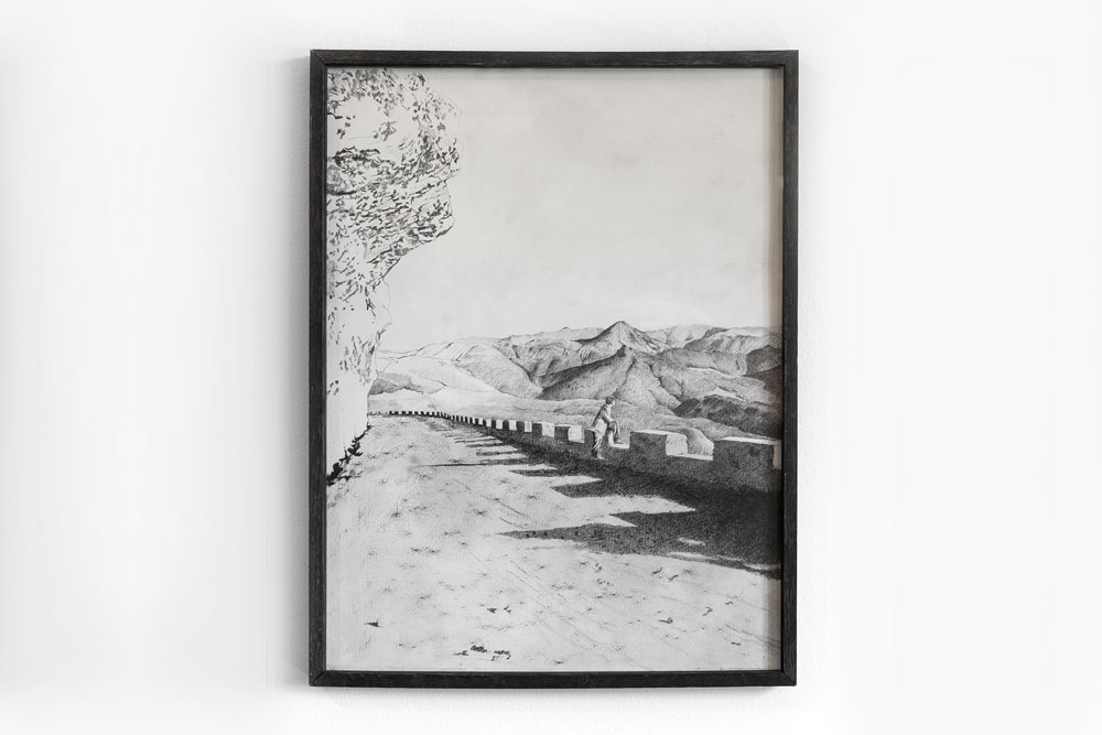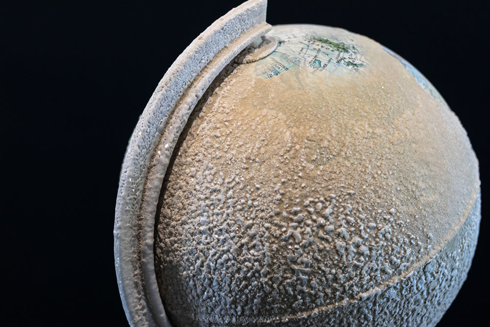 Une carte postale anonyme datée de 1952, agrandie et redessinée à la mine graphite, ouvre le parcours, mettant en scène un flâneur de dos face aux reliefs vertigineux des montagnes qu'il domine, non sans faire penser au Voyageur contemplant une mer de nuages peint par Caspar David Friedrich. Il invite à une traversée de ce territoire par le biais de fragments singulièrement transfigurés. On avance alors sur une ligne où les temporalités s'entremêlent, et où le réel tend à basculer vers la fiction, voire inversement. Usant de multiples techniques, Thomas Tronel-Gauthier a prélevé des empreintes de roches volcaniques, de cartes topographiques en relief, de fleurs endémiques de la région, ou encore de sigillaires, ces plantes qui poussaient entre le Permien et le Carbonifère aujourd'hui devenues d'étranges fossiles dont la surface rappelle des tablettes cunéiformes. Les objets indiciels récupérés sont ensuite retravaillés, devenant même parfois à leur tour des moules, avant d'être agencés avec précision dans l'espace, renvoyant dans certains cas aux méthodologies scientifiques d'indexation. D'une tombée en dégradé de gris de répliques de pierres de lave aux parcelles topographiques en bas-relief qui constellent les murs, en passant par un globe pétrifié par l'écoulement lent d'une eau chargée de calcite à sa surface au cours d'une année, ou par des pages encrées dont les contours indéfinis marquent les différentes étapes de leur séchage, nous sommes invité•es à appréhender des moments de cristallisation dans la course du temps.